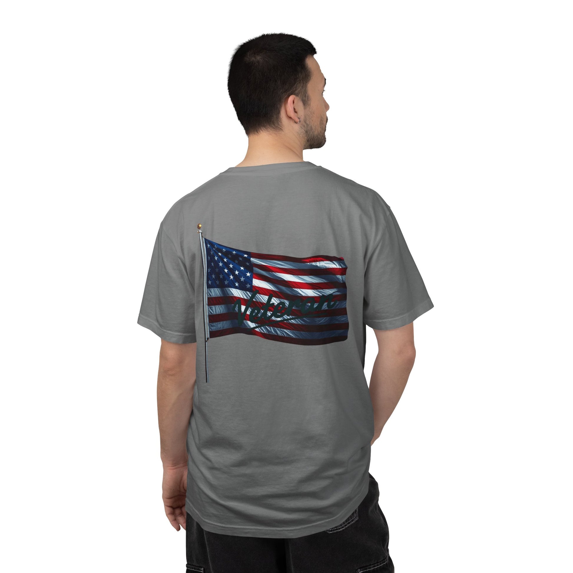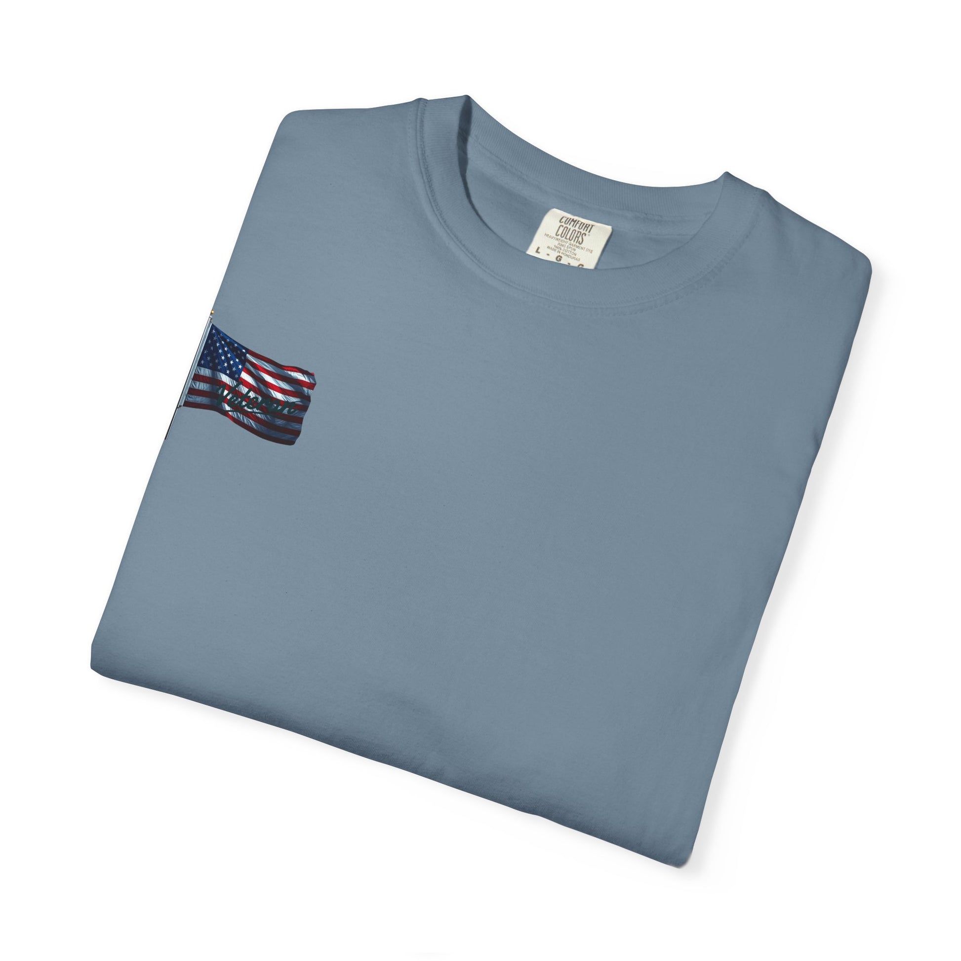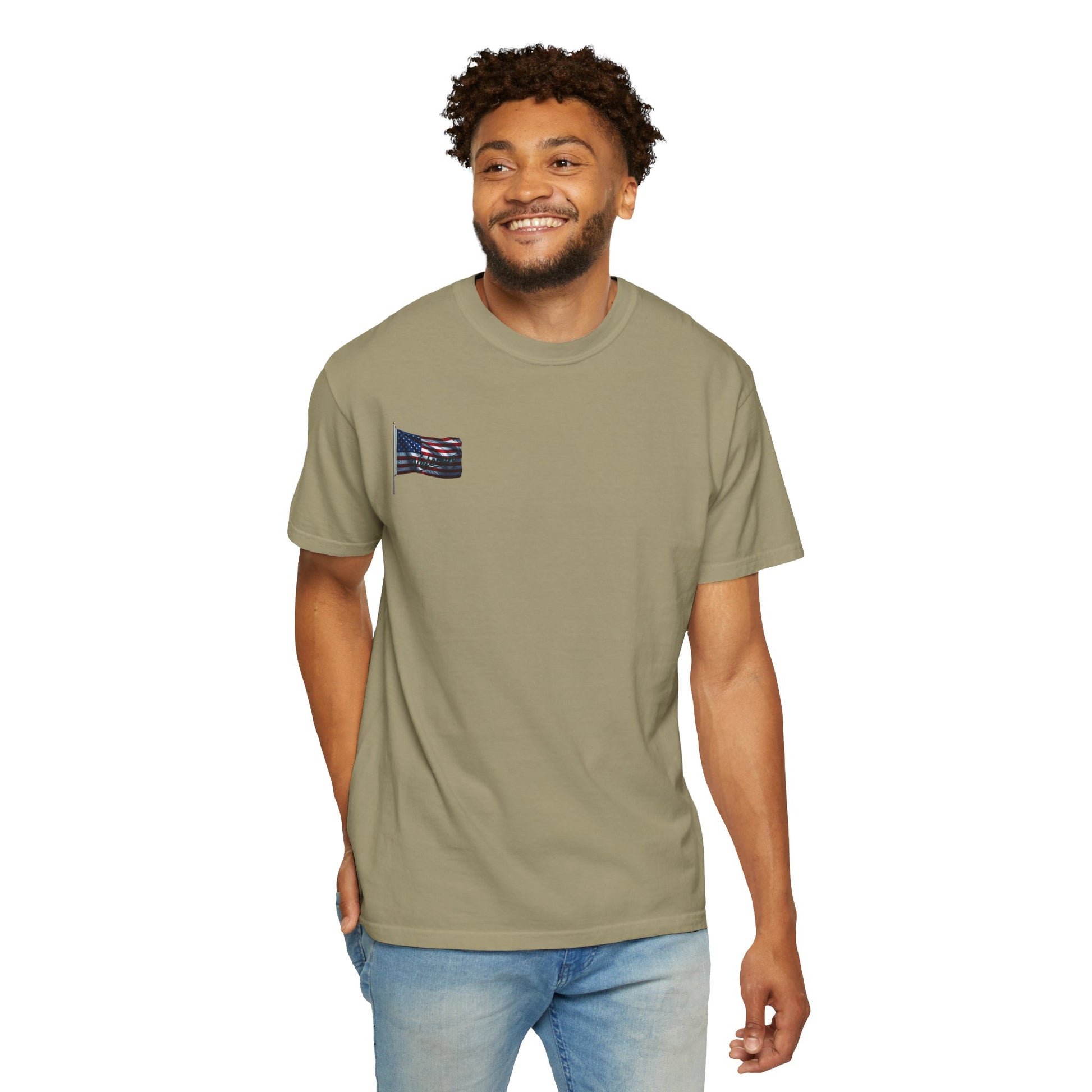 A relaxed, heavyweight tee that feels like it’s already been lived in. Garment-dyed cotton gives the fabric a soft, broken-in hand and a muted, vintage tone that lets the printed flag art sit naturally on the chest and back. The roomy silhouette and sturdy double-needle seams hold shape through repeated wear. Wear it to slow summer barbecues, roadside trips, or evenings around a backyard fire when you want something that reads lived-in, honest, and quietly bold.