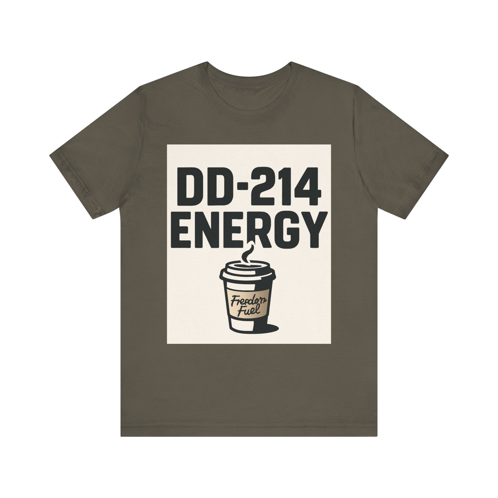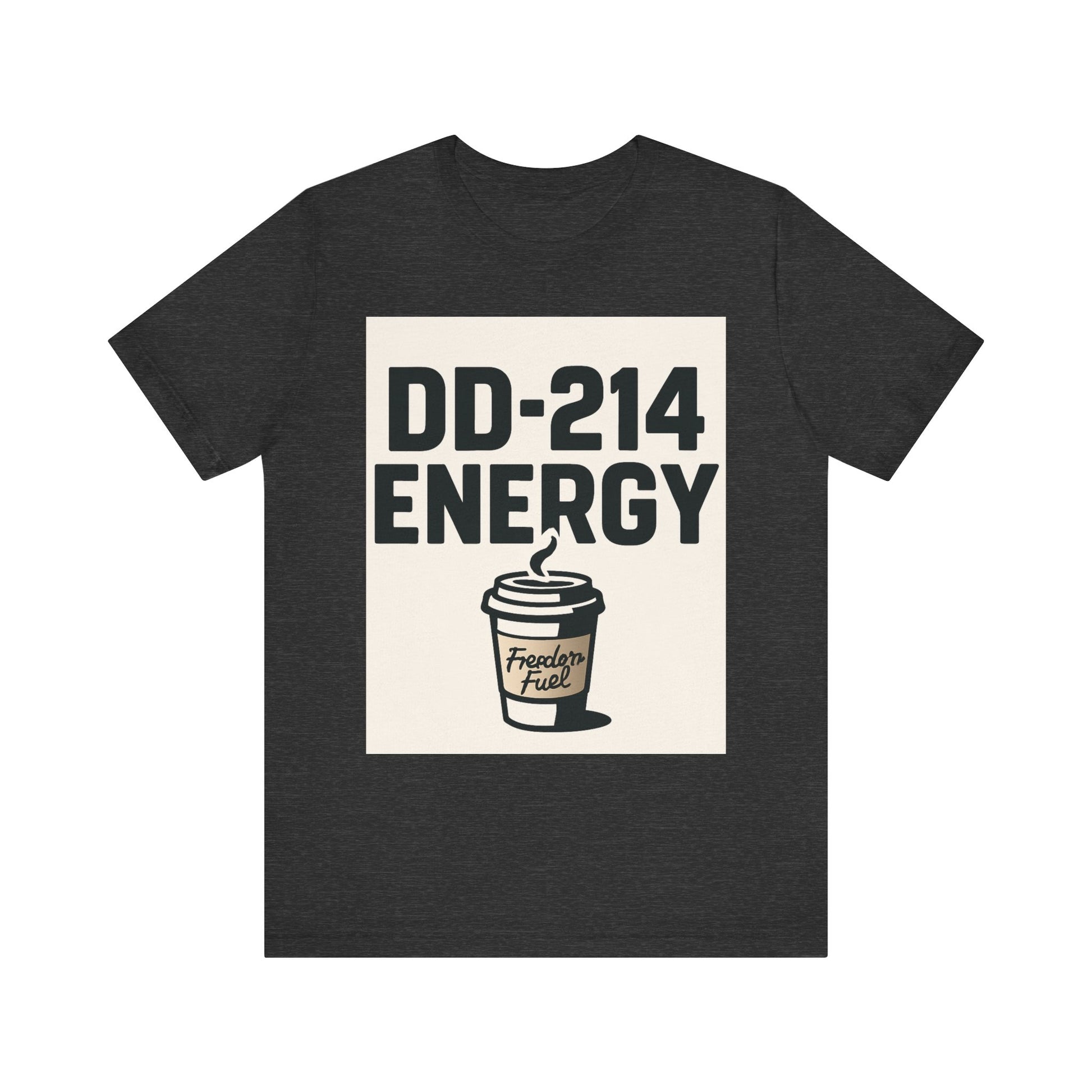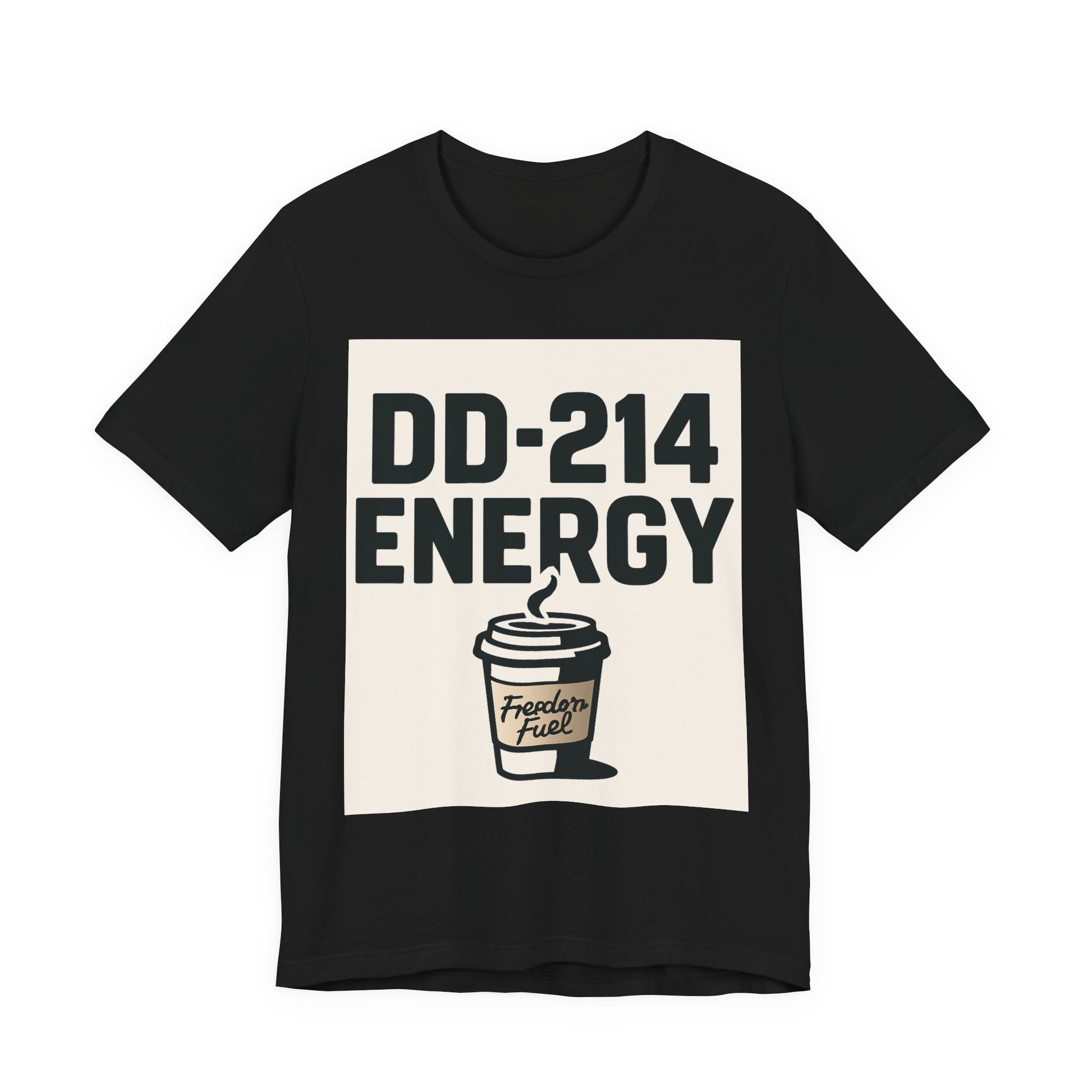 A bold 'DD-214 ENERGY' military-style font design with a small coffee cup icon labeled 'Freedom Fuel' underneath. Clean, monochrome, minimalist vintage graphic T-shirt perfect for veterans or military enthusiasts. Ideal for patriotic holidays, military celebrations, and everyday casual wear.