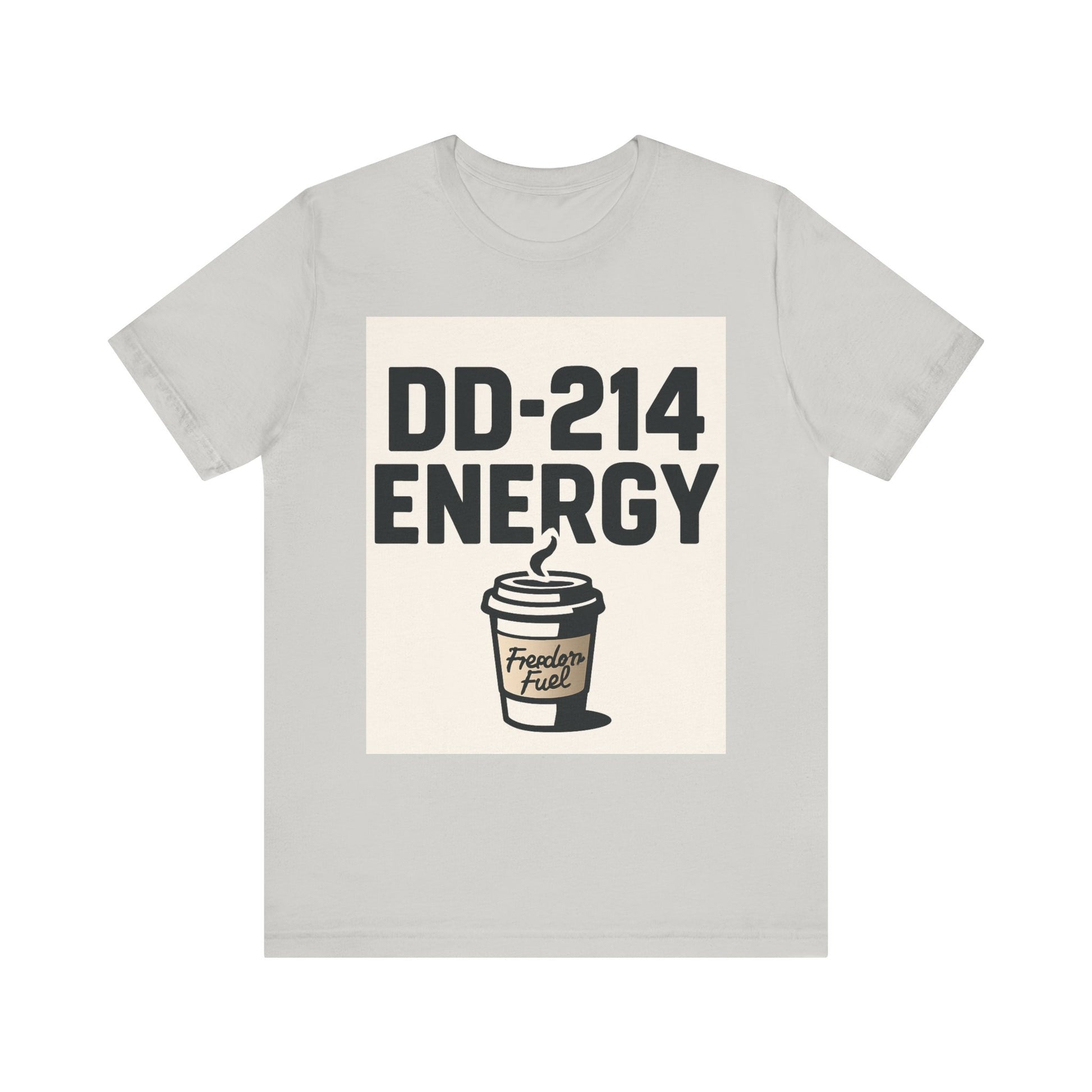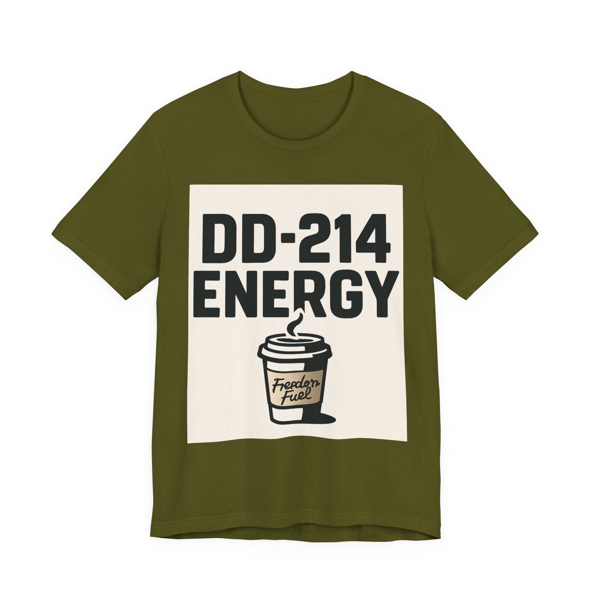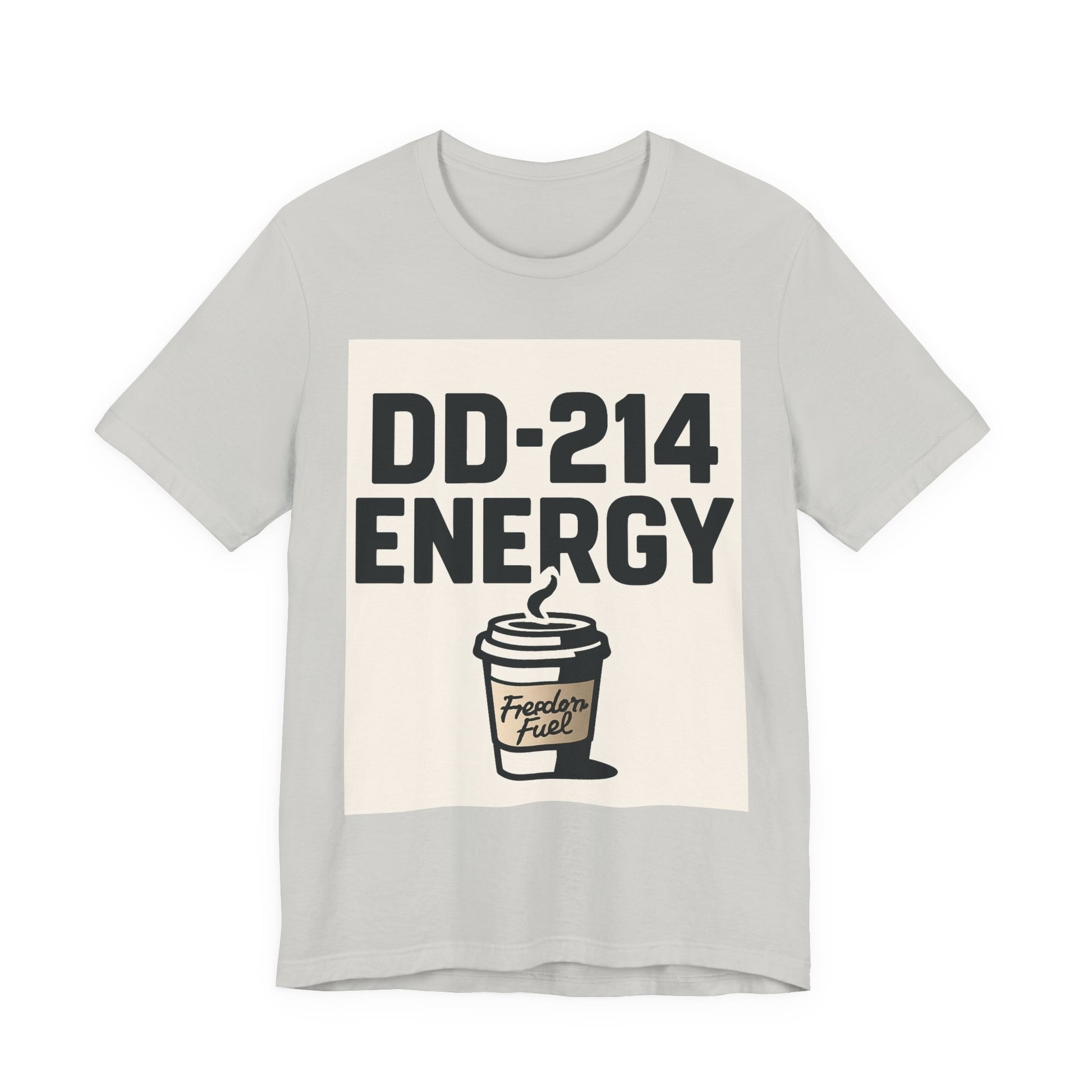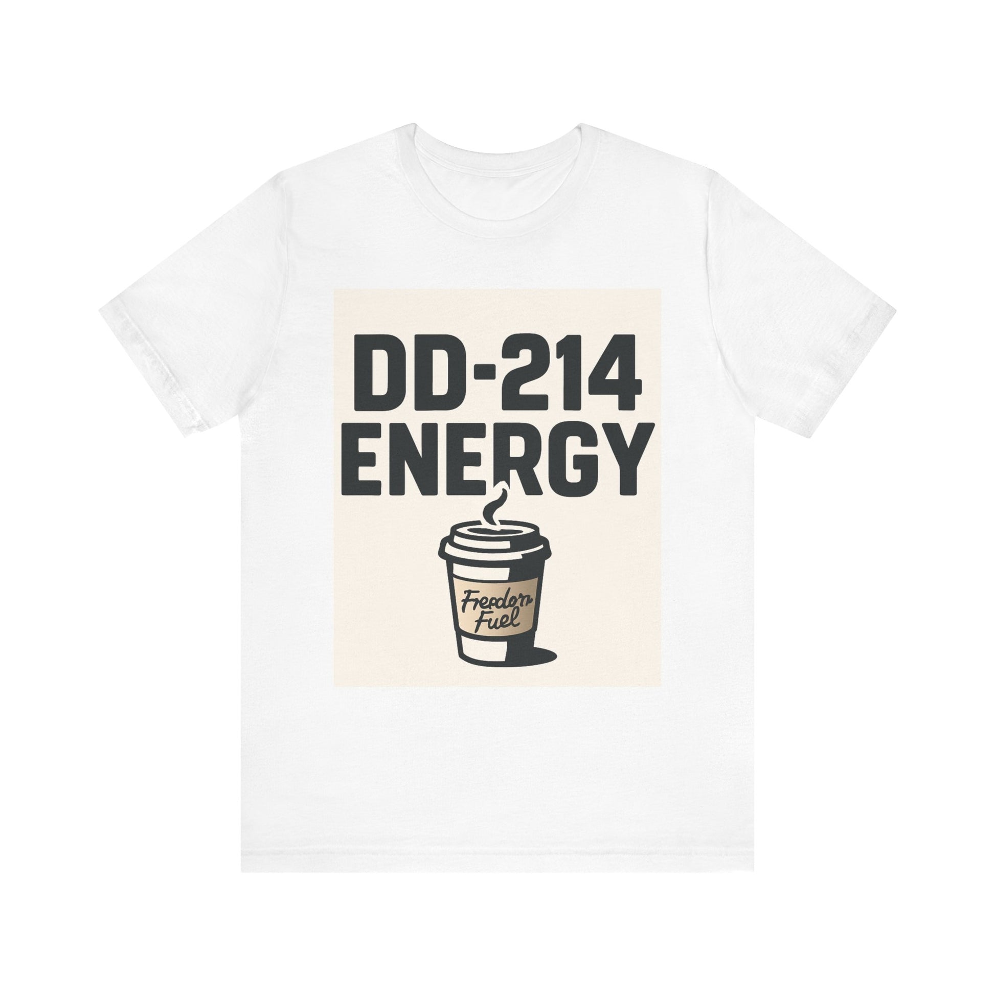 A bold 'DD-214 ENERGY' military-style font design with a small coffee cup icon labeled 'Freedom Fuel' underneath. Clean, monochrome, minimalist vintage graphic T-shirt perfect for veterans or military enthusiasts. Ideal for patriotic holidays, military celebrations, and everyday casual wear.